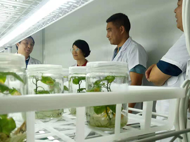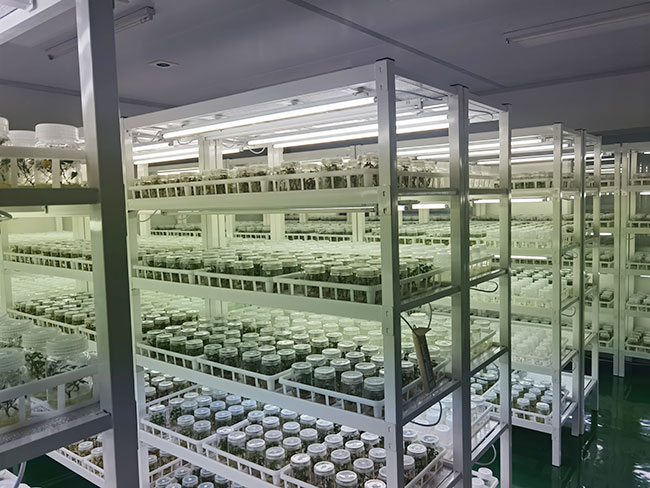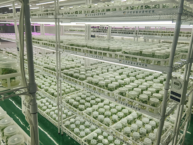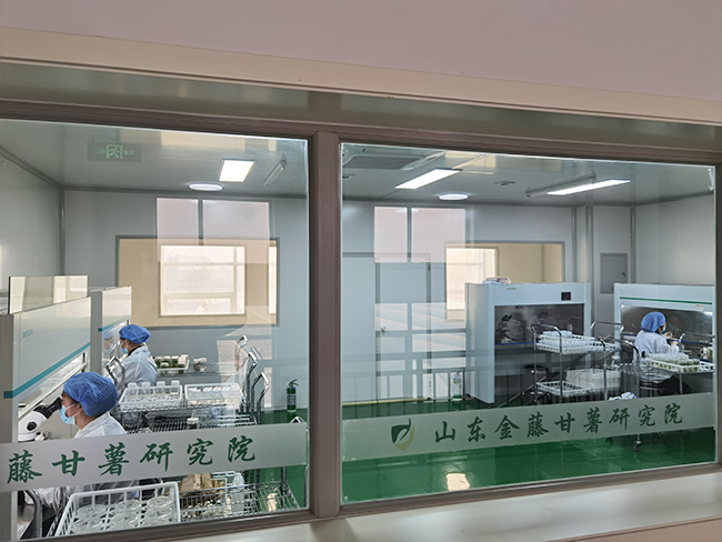 - 济宁金藤薯业科技有限公司成立于2017年,联合中国农业大学生物学院、山东省农科院、济宁市农科院10位专家教授成立山东金藤甘薯研究院,秉持“科技强农、服务惠农”的思路,创新“院所+公司+合作社+农户”模式,完善“科研、繁育、收储、销售”全链条服务。公司现有职工25人,经营土地面积1800余亩,拥有科研中心办公楼2100㎡,脱毒组培实验室1000㎡、冬暖式试管苗扩繁温室30座、种苗扩繁网棚20000m2、拱棚面积400余亩、商品薯出口包装车间2000㎡,种薯保鲜库储存能力1000万斤。 每年繁育优质脱毒种苗2亿多株,常年可提供优质脱毒试管苗、大田苗、高剪苗及各级别种薯、种苗。产品销往全国各薯区。